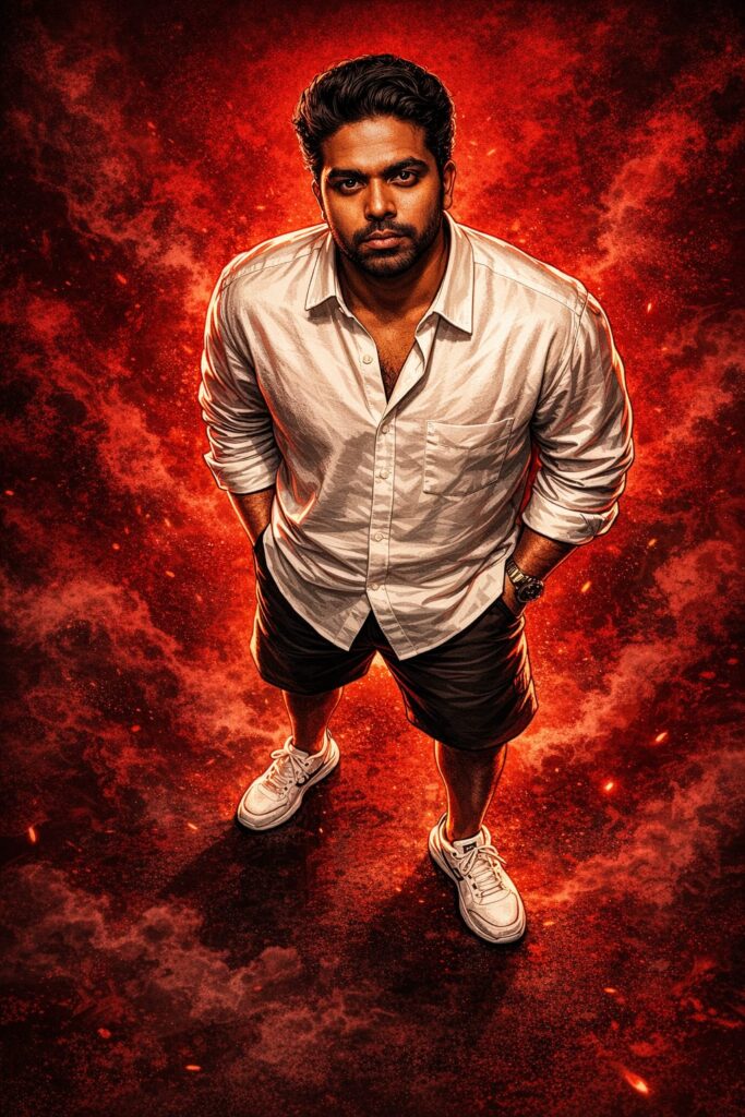 Create a cinematic digital illustration of the person in the reference photo. Maintain the exact face, identity, hairstyle, expression, skin tone, and pose with zero distortion.Transform the entire scene into a deep red high-contrast Tamil gangster movie poster style. Replace the background with red gradients, smoky atmosphere, and subtle textures. Add bold comic-book shading, thick outlines, strong blackshadows, and glossy highlights on the skin and clothes. Stylize the outfit with richer tones, clean folds, and dynamic lighting while keeping the original clothing design. Add intense highlights to the jawline, cheekbones, and edges of the body. Maintain the original pose and attitude. Create a gritty, powerful, cinematic mood with dramatic lighting and high contrast. Ultra-detailed, sharp lines, vibrant red atmosphere,action-movie poster energy, 4K illustration.