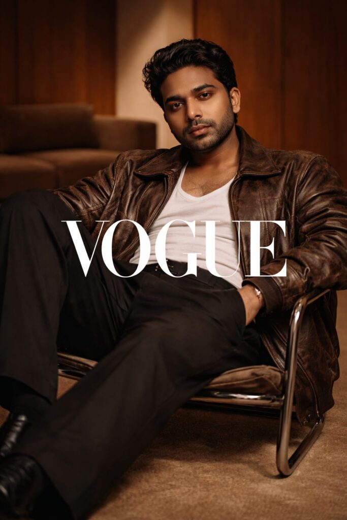 Ultra-realistic cinematic fashion editorial photograph of the SAME MAN from the reference image — exact facial identity preservation. Do not change face structure, eyes, nose, lips, jawline, beard density, or hairline. A high-fashion male model lounging inside a minimalist mid-century modern interior. He sits slightly slouched on a polished chrome cantilever chair, legs extended forward with effortless attitude and confidence. Outfit: oversized vintage brown leather jacket with natural folds and aged texture, worn over a fitted white tank top. Loose tailored black trousers softly drape over polished black leather shoes. Expression: calm, introspective, slightly moody — natural masculine confidence, relaxed gaze toward camera. Hair: medium-length dark hair, naturally tousled, softly falling over the forehead. Environment: warm wooden panel walls, suede brown sofa in background, matte brown flooring — monochromatic earthy luxury palette. Lighting: soft directional editorial lighting from camera-left, gentle shadow falloff across cheekbones and jawline, natural skin tones, cinematic depth. Camera: 85mm DSLR lens look, shallow depth of field, crisp focus on eyes, subtle background blur. Color grading: warm cinematic tones, rich browns, soft contrast, luxury Vogue-style aesthetic. Composition: low-angle perspective for dominance and elegance, centered framing, negative space around subject. Typography: elegant serif magazine title across center, spaced lettering, minimal editorial layout. ultra-detailed, photorealistic, 8K resolution, HDR, sharp textures, professional studio photography, fashion magazine cover quality.
