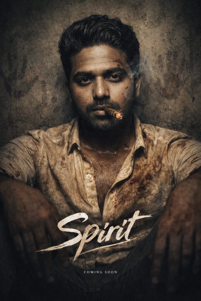 Ultra-realistic Indian mass action movie poster of the SAME MAN from the reference image. Strict facial identity preservation — do NOT change face structure, skin tone, eyes, nose, lips, jawline, beard density, or hairline. The man sits on the floor leaning against a rough stained concrete wall, centered symmetrical composition, powerful fearless expression, looking directly into camera. His face, neck and shirt are covered with sweat, dust and light bruises, showing signs of a long brutal fight. Subtle scratches on the skin, rugged and raw look (no blood or gore). Background wall has dirt marks, cracks and faded hand smears creating a violent past atmosphere. He holds a lit cigar in his mouth, smoke slowly rising across his face creating dramatic cinematic mood. Outfit: dirty off-white shirt, soaked in sweat, partially torn, open chest, gritty realistic texture. Lighting: dark moody cinematic lighting, high contrast, harsh top light + soft side rim light, dramatic shadows, raw gangster tone. Mood: intense, fearless, revenge-driven mass hero introduction. Camera: eye-level portrait framing, 50mm lens, shallow depth of field, sharp focus on face, film grain. Color grading: dark desaturated tones, deep warm highlights, gritty teal shadows, cinematic LUT. Add realistic movie poster typography at bottom — bold stylish handwritten title logo. Hyper-realistic, 8K, extremely detailed skin texture, pores, sweat realism, cinematic poster quality.
