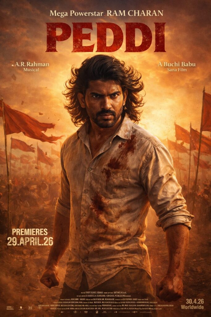 Ultra-realistic Indian mass commercial movie poster featuring the SAME MAN from the reference image — strict identity preservation, do not change face structure, skin tone, eye shape, nose, lips, jawline, moustache style, beard density or natural facial proportions. He appears as a fierce South Indian action hero, standing in a powerful front-facing pose slightly turned sideways, intense angry expression, piercing eye contact with camera. Hair transformed into thick shoulder-length wavy hair flowing in wind while maintaining recognizable hairline. Dense rugged beard (same facial growth pattern as reference). Outfit: dusty sweat-stained light beige cotton shirt, rolled sleeves, partially unbuttoned collar, dirt smudges and dark dried blood stains on chest, dark brown pants. One fist slightly clenched ready for fight. Background: large dramatic battlefield filled with hundreds of red flags planted in dry mud ground, flags blowing strongly in wind, dust particles and light fog in air. Lighting: cinematic sunset lighting, warm orange-red tones, strong golden rim light from back, soft shadows on face, realistic skin pores and sweat shine. Composition: centered symmetrical theatrical poster framing, character from thighs-up occupying middle frame, clean bright sky area on top for title placement. Ultra-detailed, hyper realistic, 8k, cinematic color grading, shallow depth of field, film grain, dramatic contrast, theatrical poster quality, Indian mass cinema style. 🧾 TEXT ON POSTER Add this at the end of the prompt: Add cinematic typography: Top small text: “Mega Powerstar RAM CHARAN” Large distressed red title at top center: “PEDDI” Left: “An A.R. Rahman Musical” Right: “A Buchi Babu Sana Film” Mid-left white bold: “PREMIERES 29.APRIL.26” Bottom cinematic production credits Bottom right: “30.4.26 Worldwide”.