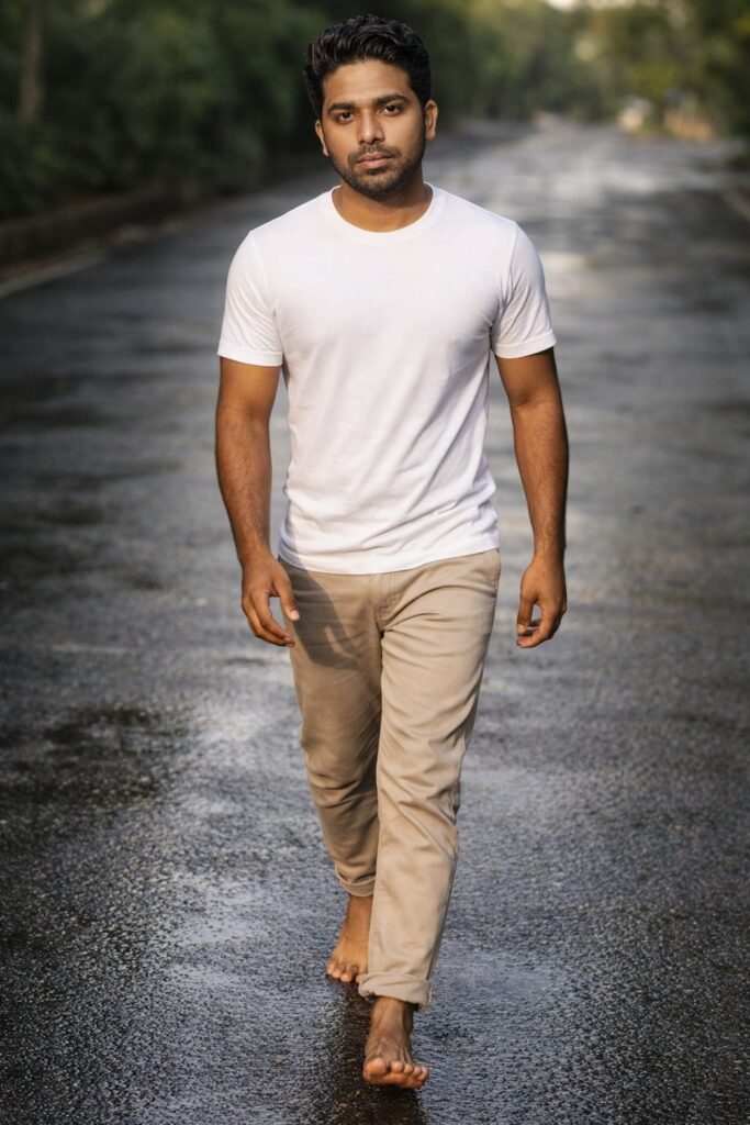 Wearing a fitted plain white crew-neck t-shirt and slim beige chinos slightly rolled at the ankles, barefoot.