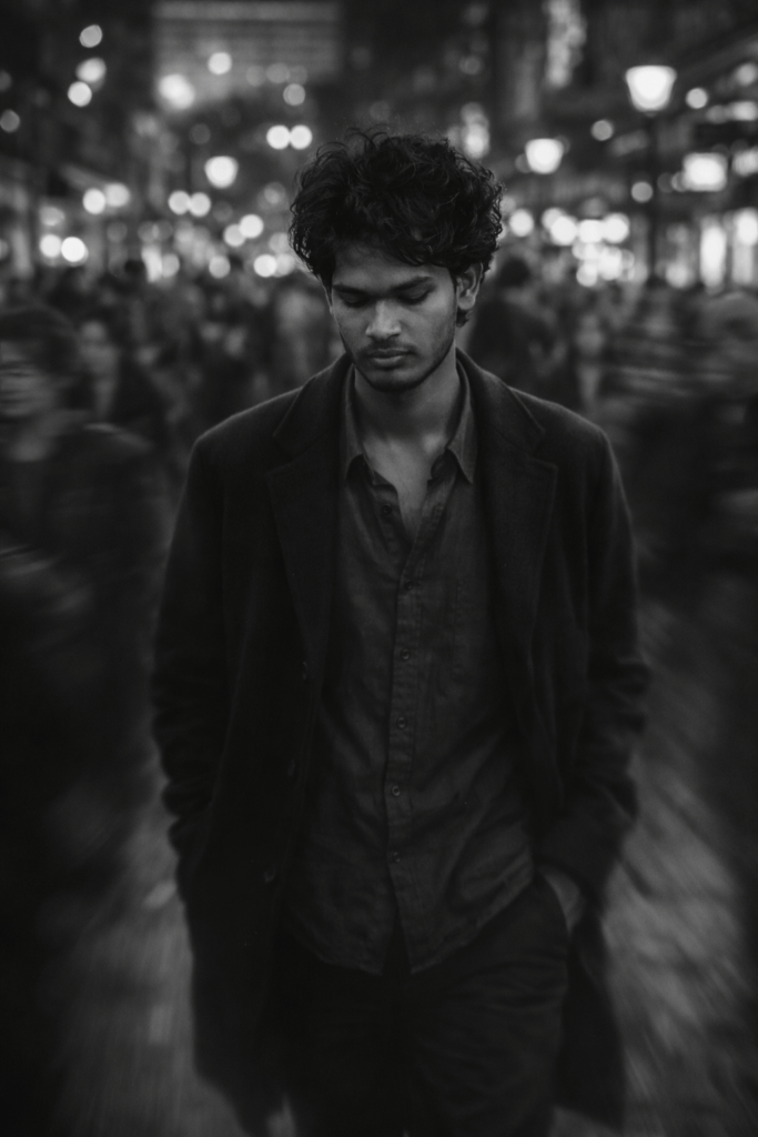 Create an ultra-realistic black-and-white cinematic portrait of a young man walking alone through a crowded night-time city street. Use the provided face reference EXACTLY — facial structure, proportions, skin texture, and identity must remain unchanged. Pose & body language: The man is walking forward naturally with a slightly lowered head and eyes looking down, not at the camera. His shoulders are relaxed, posture subtle and realistic, conveying quiet introspection and emotional weight. No confident or model-like posing — the movement should feel candid and unposed. Scene & motion: He remains sharply in focus while the surrounding crowd is heavily motion-blurred, people passing on both sides. Long-exposure motion blur creates a strong sense of isolation within the crowd. The background city lights stretch into soft abstract bokeh streaks, street lamps and shop lights glowing in the distance. Appearance: Hair slightly tousled by movement, natural and imperfect. Wearing a dark overcoat layered over a loosely unbuttoned shirt. Minimal styling, realistic fabric textures. Mood & style: High-contrast black-and-white grading, deep shadows, cinematic lighting. Shallow depth of field, dramatic motion blur. Film-noir atmosphere, moody, emotional, lonely urban feeling. Clean poster-style framing, centered subject, ultra-detailed, crisp 8K realism.
