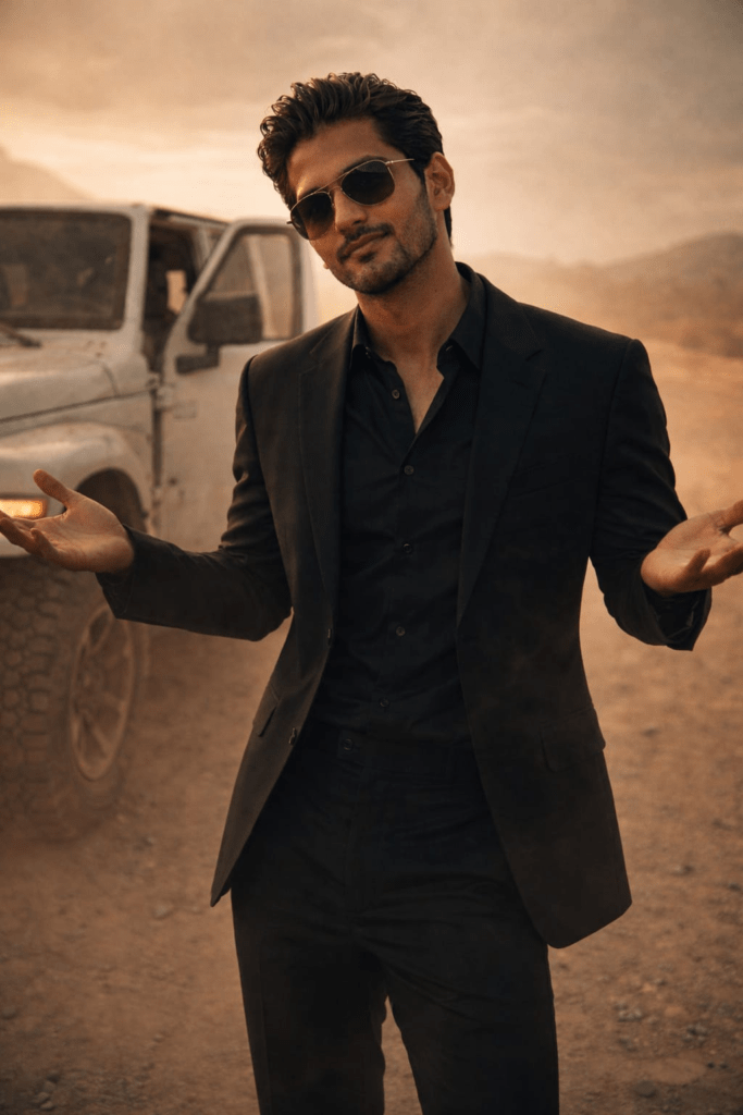 A cinematic shot of a stylish man standing in a dusty desert landscape beside a white off-road SUV with the driverβs door open. He is wearing an all-black suit with a black shirt, no tie, and dark aviator sunglasses. His hair is slicked back, and he has a confident, slightly smug expression. He stands with both arms slightly out to the sides, palms up, in a casual βwhat can I say?β gesture. The environment is hazy with warm, sandy tones and soft diffused sunlight, creating a dramatic, high-contrast, movie-scene atmosphere. Shallow depth of field, dramatic color grading, widescreen cinematic composition, ultra-realistic, high detail.