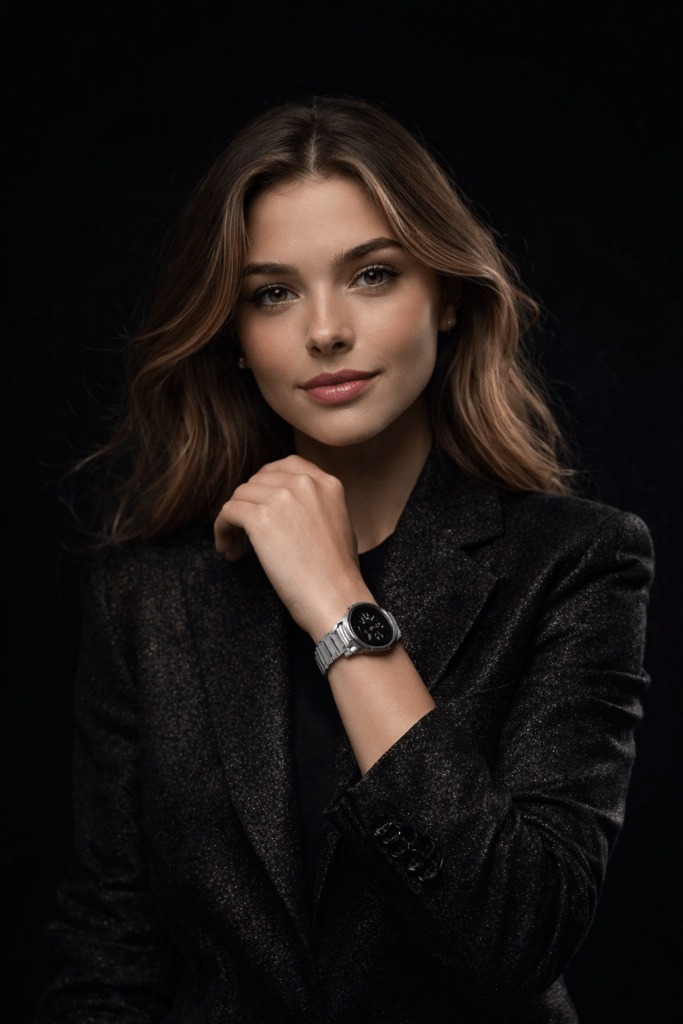 Use the uploaded image as the ONLY face and identity reference. Preserve the subject’s exact real facial features with zero alteration — same face shape, eyes, eye spacing, eyebrows, nose, lips, jawline, skin tone, skin texture, age and gender. Do not beautify, stylize, or change facial structure. Convert the subject into a high-end cinematic studio portrait: subject wearing a dark textured formal blazer, minimal inner clothing, luxury metal wristwatch, hand gently raised near the chin in a confident editorial pose. Pure black studio background, dramatic low-key lighting with a soft key light on the face, deep shadows, subtle rim light on hair. Expression should be calm, confident, serious, cinematic (no smile). Shot like a professional fashion editorial using 85mm lens, shallow depth of field, ultra-realistic skin texture, high contrast, soft highlights, photorealistic, 8K quality. The result must look 100% real, DSLR studio photography, not AI-generated.