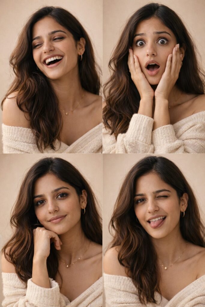 Four-panel portrait collage of the same young woman, studio beauty photography, soft neutral beige background. She has long, voluminous dark brown hair, warm medium skin tone, and natural soft-glam makeup. She is wearing an off-shoulder cream knit sweater and a delicate gold necklace with a small pendant. Top left panel: She is laughing naturally, head slightly tilted back, eyes partly closed, joyful carefree expression, candid moment energy. Top right panel: She looks shocked and surprised, eyes wide open, mouth slightly open, both hands gently pressed against her cheeks, playful dramatic reaction. Bottom left panel: Calm and confident pose, chin resting lightly on one hand, soft relaxed gaze toward camera, subtle warm smile, elegant beauty pose. Bottom right panel: Playful and cheeky expression, winking one eye with her tongue slightly out, fun flirty energy, lighthearted personality. Soft flattering studio lighting, smooth natural skin tones, warm highlights, gentle shadows, cinematic portrait photography, 85mm lens look, shallow depth of field, glossy healthy hair, ultra-detailed, professional beauty shoot, high resolution.