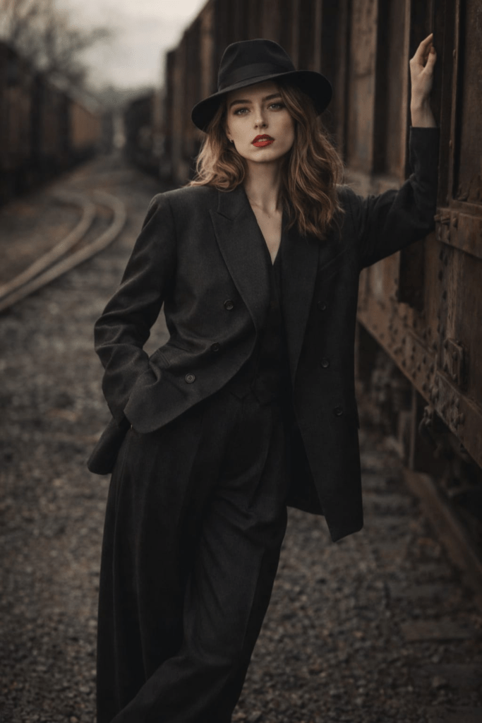 Ultra-realistic cinematic fashion photograph of a confident young woman standing beside a vintage freight train on old railway tracks. She is leaning casually against the metal train car, one arm raised touching the edge, relaxed yet powerful posture. Wearing a dark charcoal oversized double-breasted suit with wide-leg trousers, tailored but slightly loose fit, vintage 1940sā1950s inspired fashion. Black fedora hat tilted slightly, soft blonde wavy hair falling to shoulder length, bold red lipstick, sharp facial features, confident expression. Minimal accessories, subtle makeup, elegant and timeless look. Environment: Old industrial railway yard, rusted freight wagons, rough gravel ground, muted tones, cinematic depth. Lighting & Style: Natural soft daylight, moody cinematic lighting, shallow depth of field, creamy bokeh background. Muted color grading, earthy browns, greys, and blacks. Shot on full-frame camera, 85mm lens, f/1.8, ultra-high detail, fashion editorial style. Quality: Ultra-realistic, sharp focus on subject, professional fashion photography, high resolution, editorial magazine look.