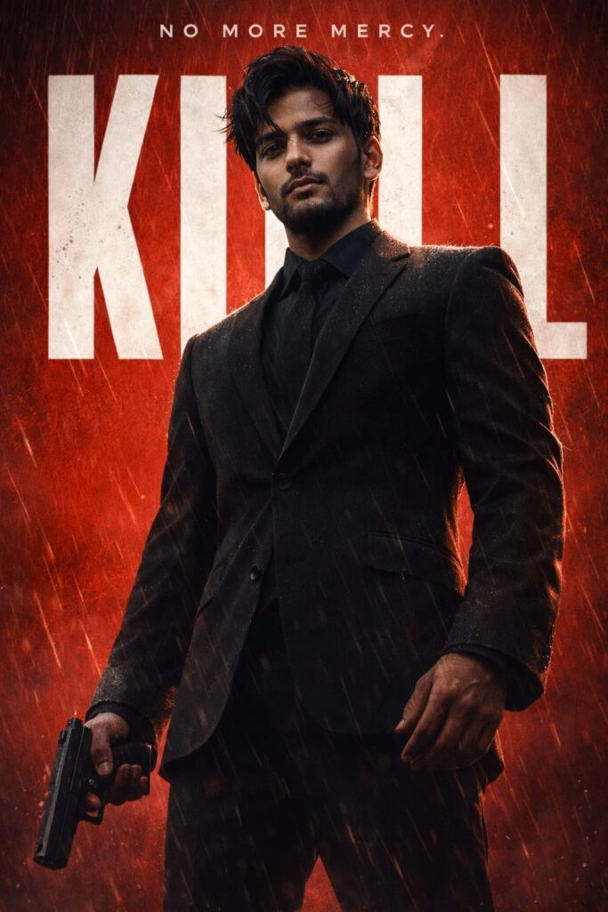 Ultra-cinematic action poster, vertical composition. A tall, intimidating man in a perfectly tailored black suit stands facing the camera from a low angle, creating a powerful, dominant presence. His hair is medium-length and slightly wet, strands falling near his face. Light stubble, sharp jawline, calm but deadly expression. He holds a pistol loosely at his side, finger off the trigger, posture relaxed but ready. Rain streaks diagonally across the scene, catching highlights. His suit is dark, matte, slightly textured, with a black shirt and tie underneath. Background is a solid, bold red backdrop with subtle gritty texture. Behind him, huge white block letters stretch across the frame in a modern, condensed font, partially obscured by his silhouette. At the top, smaller dramatic tagline text in white. Lighting is high-contrast and moody: strong rim light outlining his shoulders and hair, soft shadow across parts of his face, cinematic noir style. Slight film grain, ultra-sharp focus, dramatic poster composition, action-thriller aesthetic, 4K detail. Style keywords: neo-noir, assassin thriller, dramatic poster art, high contrast, rain atmosphere, bold typography, cinematic lighting.