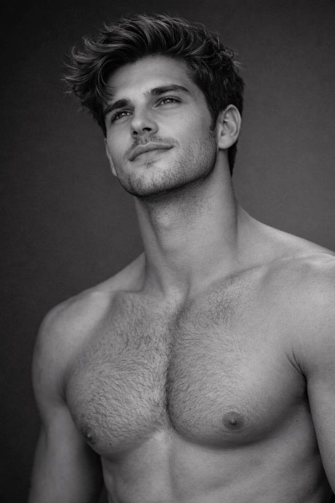 Transform the subject to match the exact pose, attitude, and composition of the first reference image: shirtless male portrait, upper body visible, head tilted slightly upward, eyes looking above the camera, calm and confident masculine attitude, relaxed jaw, neutral lips, no smile. Maintain the same body posture, neck angle, shoulder alignment, and chest framing as the first image. Convert the image to high-contrast black and white, studio-style lighting with soft directional light from the side creating gentle shadows on the face, neck, and chest. Background must be a plain dark gradient studio backdrop. Preserve realistic skin texture, natural pores, light stubble, and subtle chest hair. Do NOT beautify, stylize, or exaggerate features. The result must look like a professional editorial studio portrait, ultra-realistic, DSLR quality, sharp focus, natural contrast — no AI look, no cartoon effect, no plastic skin. Keep everything photorealistic and cinematic, matching the first image exactly in mood, pose, and attitude.