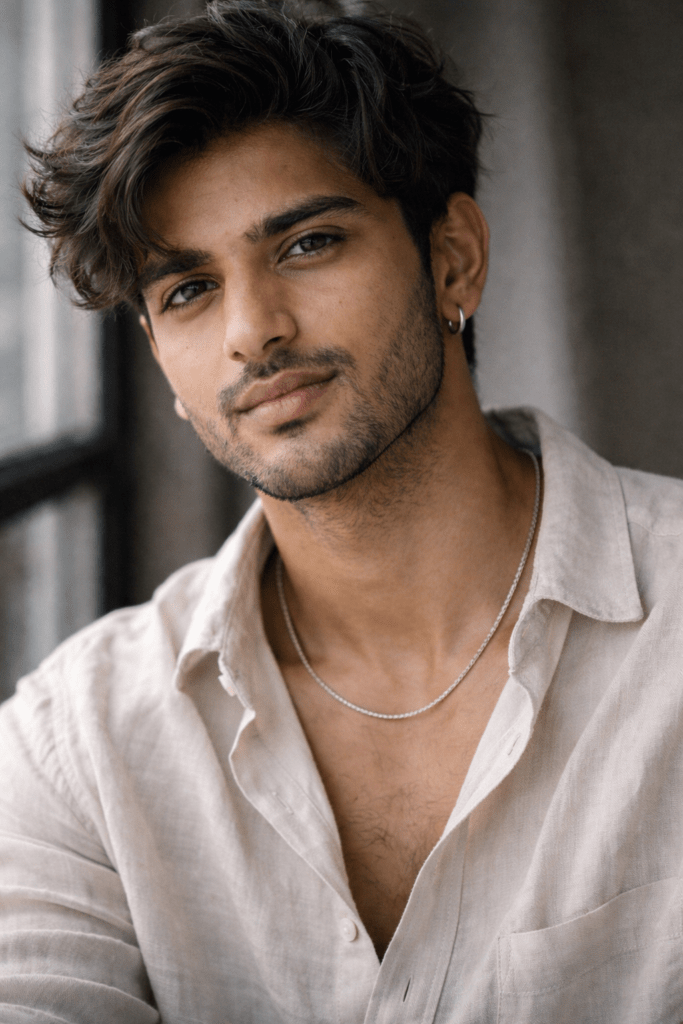 A cinematic editorial-style portrait of a handsome young man with wavy medium-length hair falling naturally around the face. Sharp jawline, well-groomed stubble beard, expressive light-colored eyes, slightly parted lips with a relaxed confident expression. Wearing a casual off-white buttoned shirt slightly open at the chest, minimal silver jewelry including small hoop earrings and a thin chain necklace. Soft dramatic lighting with natural skin texture, subtle highlights and shadows. Shallow depth of field, blurred background, fashion photography aesthetic, candid moment, high-detail, ultra-realistic portrait, professional DSLR look, cinematic color grading.